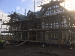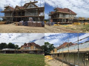 The build spec is 5 bedroom, 6000 sq foot with an internal swimming pool. The build should take a year and Parkgate Construction, as well as managing the project, work alongside our carefully selected Sub-Contractors all picked from our Approved Sub Contractors database. Kenward Groundworks kicked off the project by successfully completing the demolition and foundations in readiness for the arrival of the timber frame from Scandia-Hus. Once the foundations were finished and the frame was up, phase 1 was efficiently completed, keeping to schedule including the scaffolding up, block and beam floor finished (as part of the foundations).